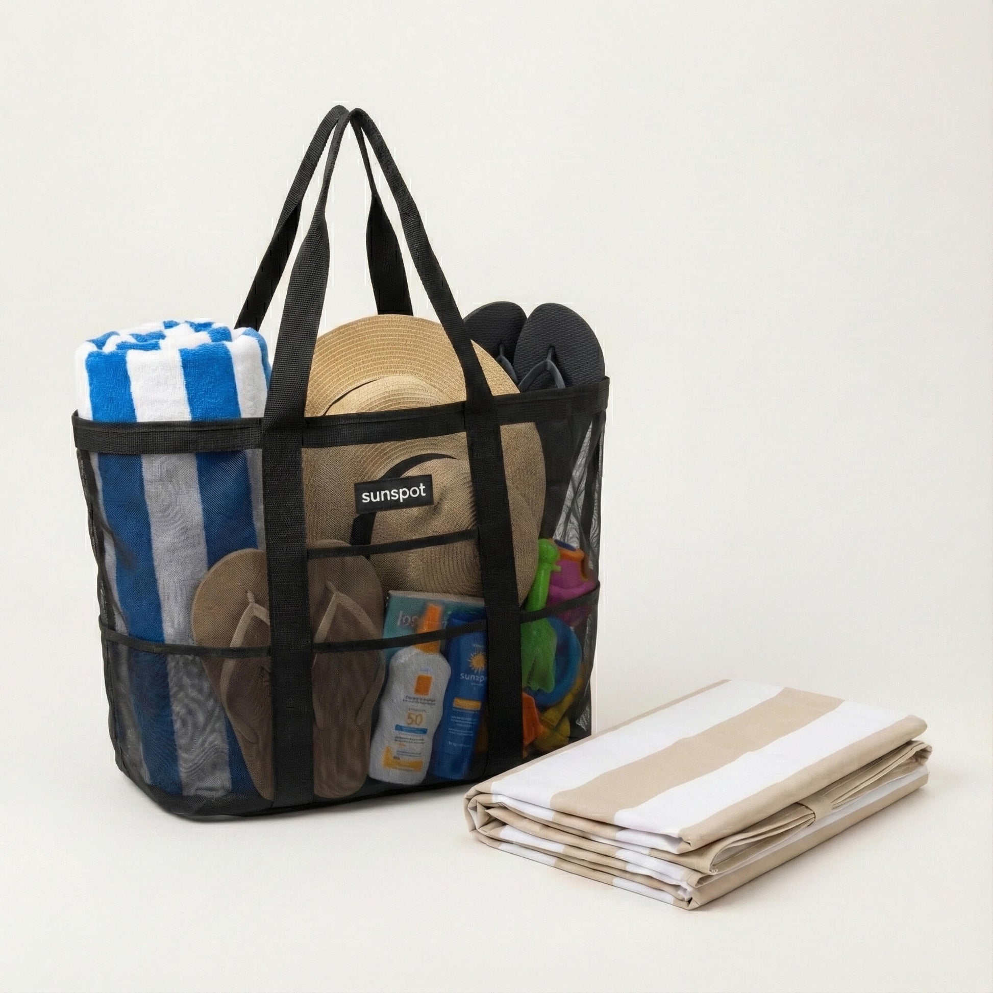 Stay sand-free and organized with this lightweight mesh beach bag. At 26" x 15" x 8", it’s roomy enough for all your gear and comes with a built-in 7ft x 6.5ft pull-out beach blanket. Includes 4 grass stakes to keep your blanket secure on grass