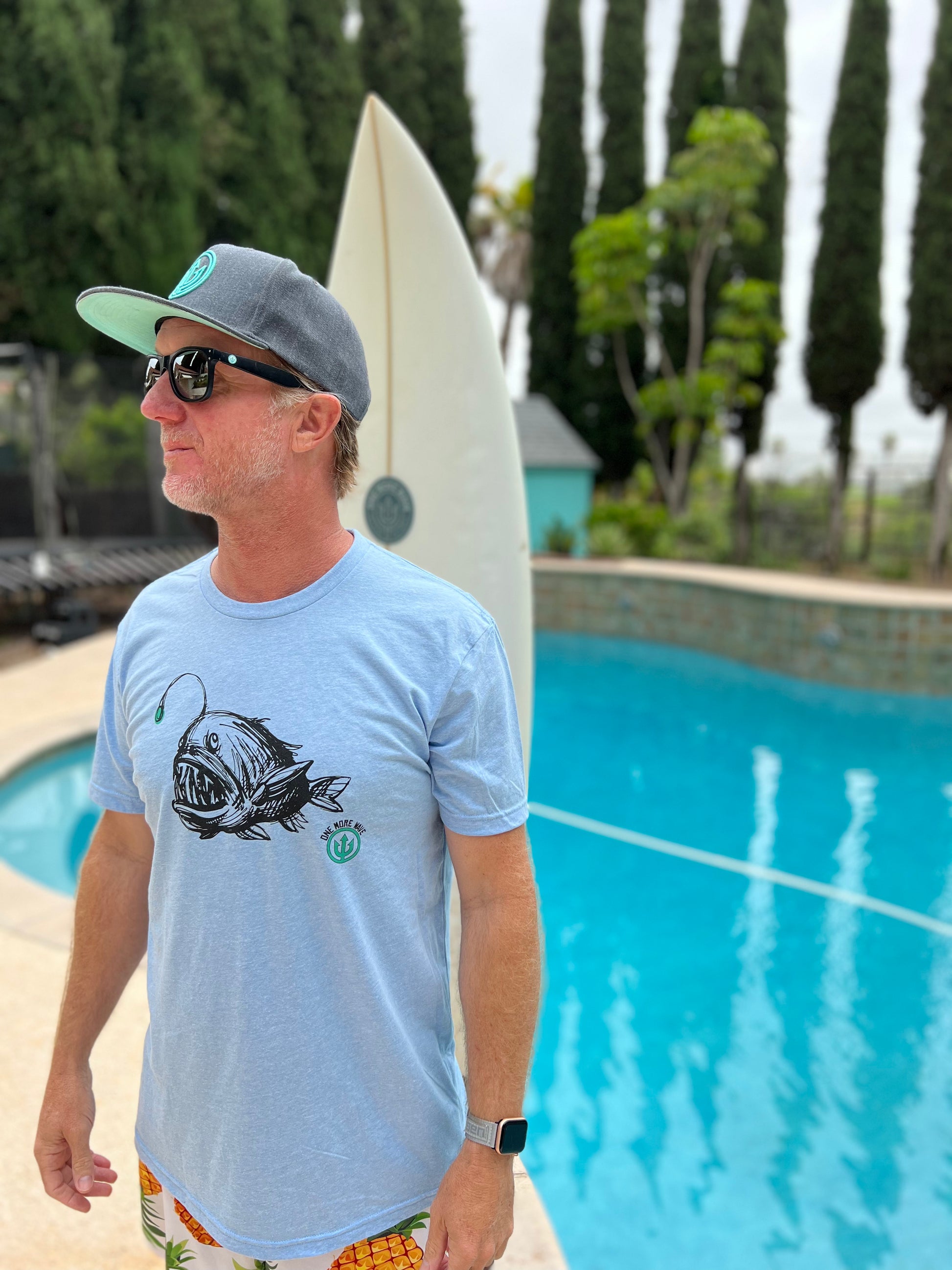 Introducing the captivating T-shirt that brings together the mystical allure of the deep sea and showcases fantastic support of One More Wave. This unique shirt features a drawing of an anglerfish showcasing its mesmerizing bioluminescent lure. The strokes of the pencil create a level of detail, capturing the anglerfish's mysterious and ferocious essence.