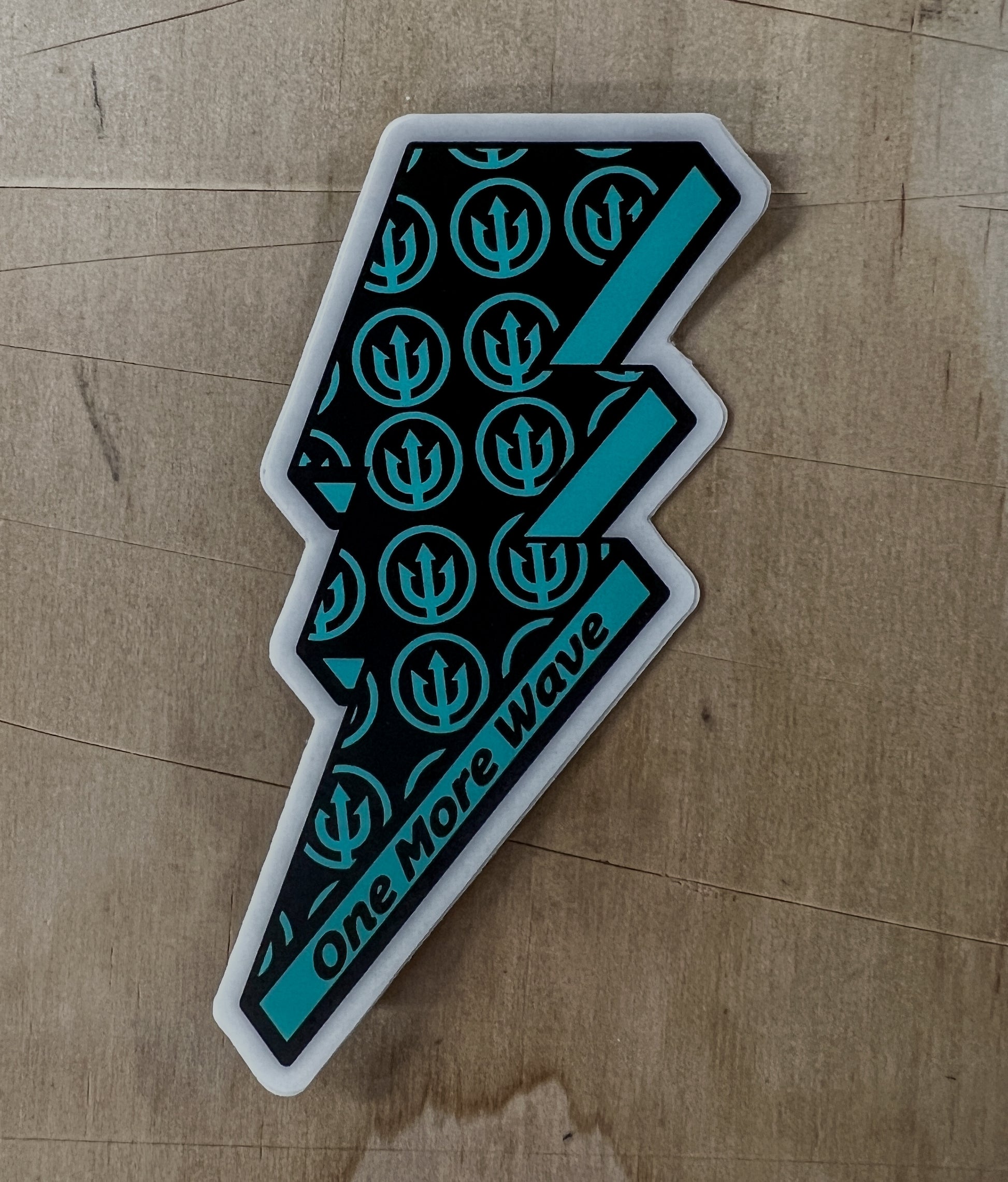 Electrify your style with this dynamic lightning bolt sticker, where the raw energy of the bolt is punctuated by scattered One More Wave teal logos. The vivid contrast between the bold lightning strike and the subtle teal accents creates a visually striking and empowering design. A perfect fusion of intensity and subtlety, this sticker is not just an accessory but a statement piece, symbolizing the relentless pursuit of catching that "One More Wave."